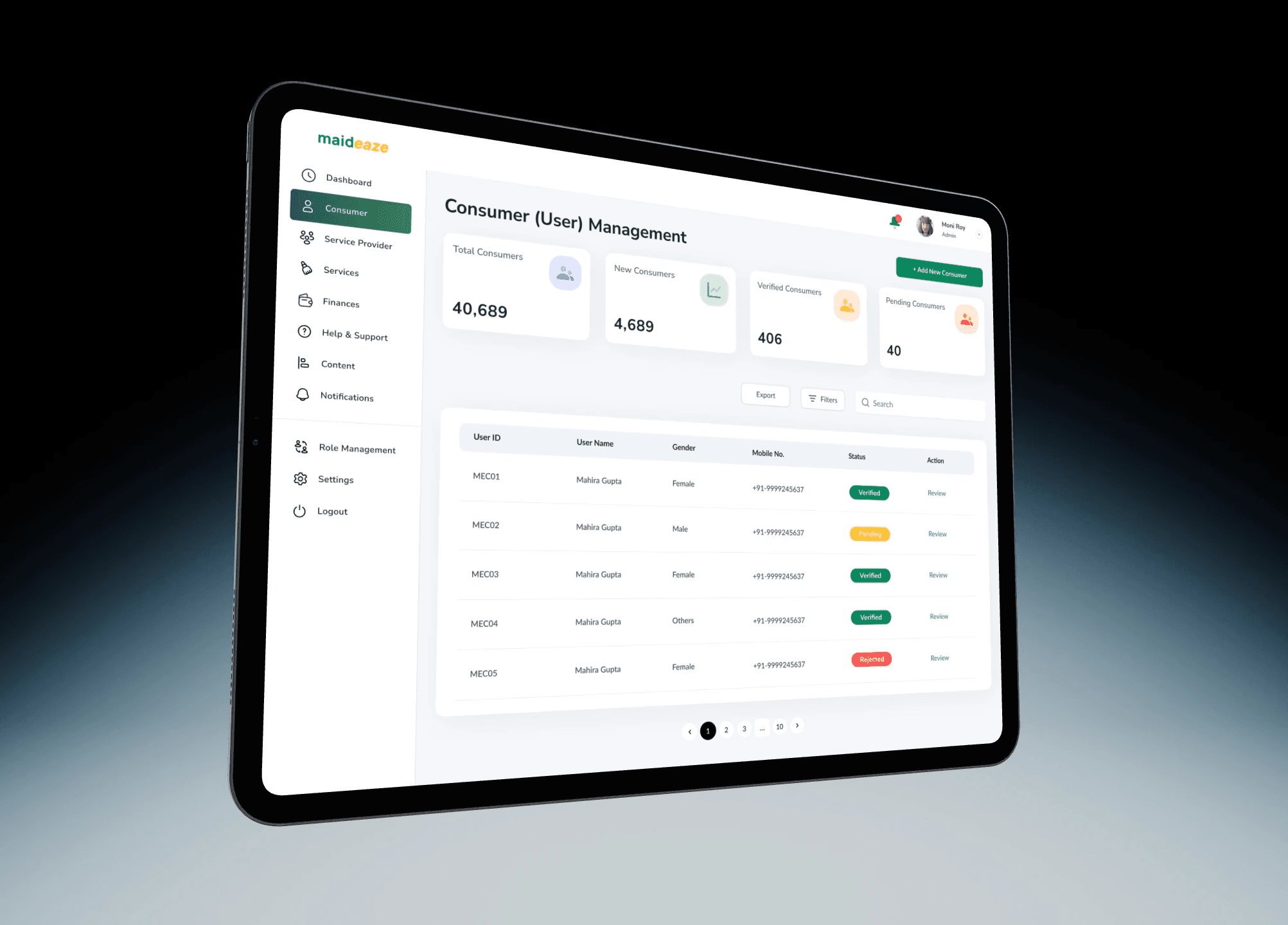 Maideaze is a dual-sided home services platform offering chore-based services like cooking, cleaning, babysitting, patient care, and more. The project involved designing two distinct mobile apps: one for users to browse, book, and track services; and one for maids/service providers to manage jobs, mark attendance, and track earnings.